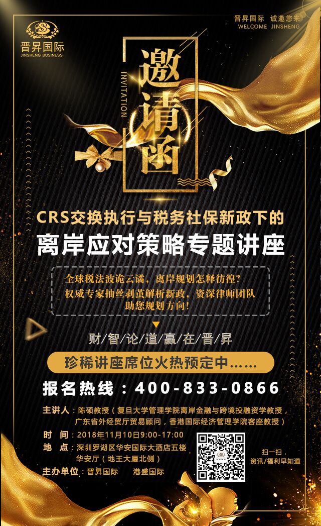 2018年10月23日,港盛國際、晉昇國際攜手恒生銀行及承以信律師事務所在上海成功舉辦了《后CRS時代的離岸資產稅務規劃與安全保障暨中國香港投資優勢&貿易融資》高端專題講座,現場三位專業講師為客戶分別講述中國香港投資的優勢以及銀行的角色定位、中國香港恒生銀行貿易融資介紹及后CRS時代與稅改新政下,離岸資產稅務規劃與安全保障的新策略等精彩內容。