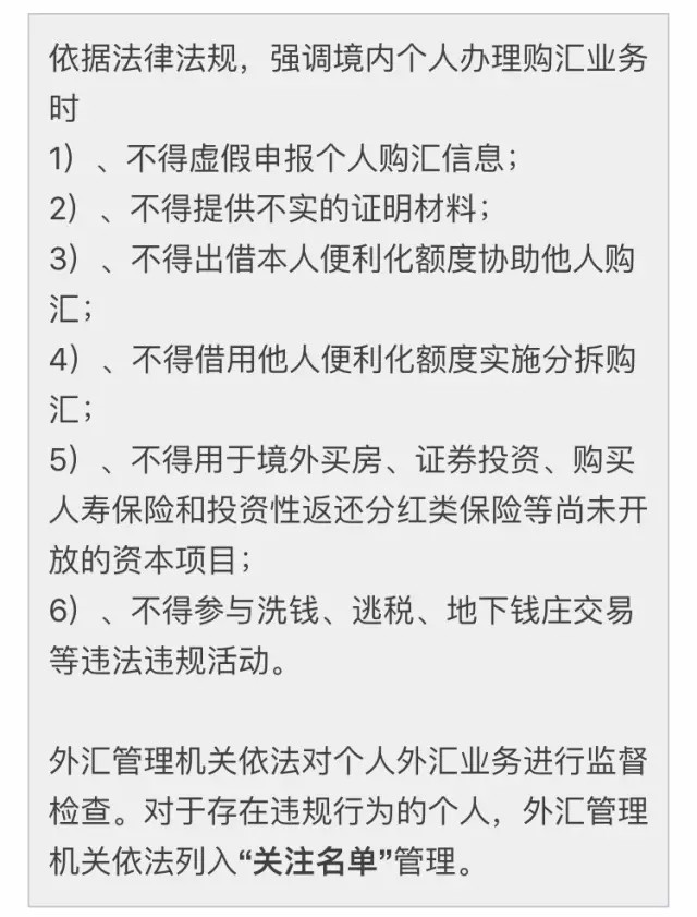 新政以前一次可以多可以匯五萬美元,新政實施后每次只能匯一萬美元。頻繁匯款可能會被懷疑成"螞蟻搬家"列入關注名單,取消5萬匯購額度2年。