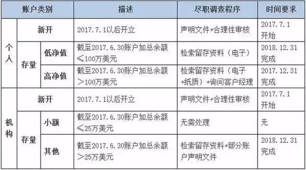 2018年12月31日前,完成對其余存量個人低凈值賬戶和所有存量客戶的盡職調查程序,識別其中的非居民賬戶。