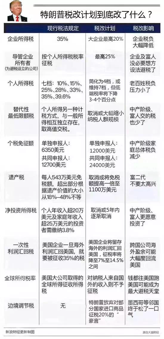 企業所得稅率從35%降至20%,降低的部分不僅可以轉換為企業的利潤,而且大幅降低企業所得稅,將使得在美國的投資建廠成本更低,按這個稅率,一些制造業企業選擇在美國注冊公司、投資建廠,將完勝在中國的產業鏈布局。此外,15%的稅率加上美國經濟體量龐大帶來的規模效應,有望使實體經濟步入良性循環。