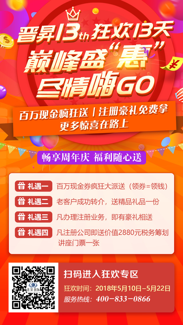 福利到!晉昇十三周年慶典,巔峰盛"惠"第一波福利強勢來襲!"感恩十三年,狂歡十三天"!百萬現(xiàn)金券瘋狂大派送!掃碼領券等于領錢!中國香港、海外公司立減1488元!更有繽紛豪禮隨心送!多重優(yōu)惠同時享!周年慶典感恩回饋!越早下單,優(yōu)惠越大!抓住機會,盡情嗨GO~~~