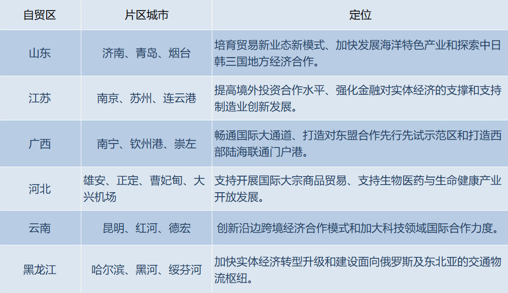 8月26日,國務院印發《中國(山東)、(江蘇)、(廣西)、(河北)、(云南)、(黑龍江)自由貿易試驗區總體方案》。8月30日,6個新設自貿試驗區正式掛牌成立。隨著山東、江蘇、河北新設自貿區,我國沿海省份自貿區實現全覆蓋;而廣西、云南、黑龍江新設自貿區,則讓自貿區在沿邊地區首次落地生根。