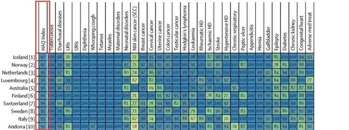 報告參考2016年全球疾病負擔的研究,以全球195個國家和地區為對象,針對32項評估指標計算出具體醫療質量和可及性指數(Healthcare Access and Quality Index,以下簡稱HAQ),分值在0-100之間。分數越高,說明醫療質量和可及性越好。