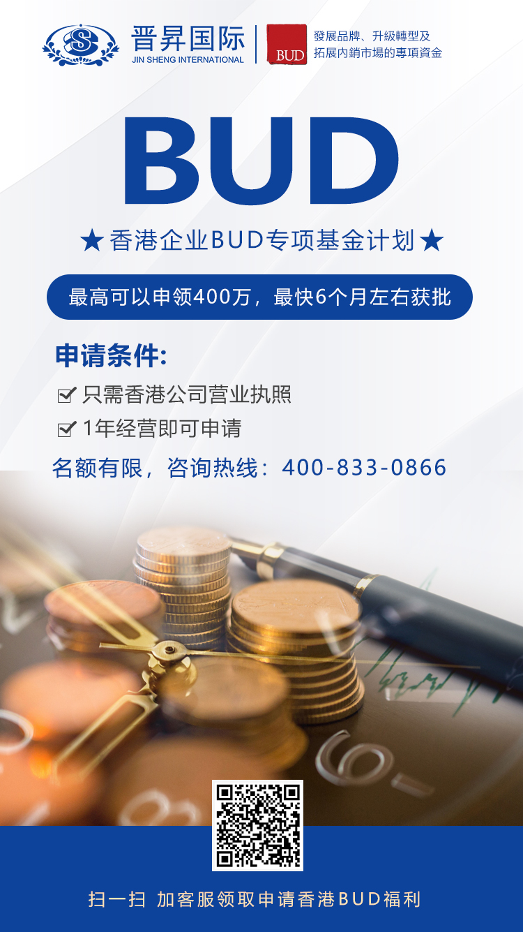 BUD,全稱發展品牌、升級轉型及拓展內銷市場的專項基金。專為中小企業,包括初創企業,協助把握經濟機遇和提升競爭力。通俗的說任何有助個別中國香港企業透過發展品牌、升級轉型及/或拓展中國內地及自貿協定經濟體市場的項目均可申請資助。