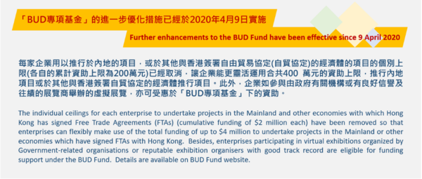 早在2019年度8月財政司司長就進一步向BUD專項基金注資總計20億元,進一步擴大基金的資助適用范圍至涵蓋所有在至及將來與中國香港簽署自貿協定的經濟體,推出「自貿協定計劃」(東盟計劃被納入其下),讓企業可開拓新市場及新商機。